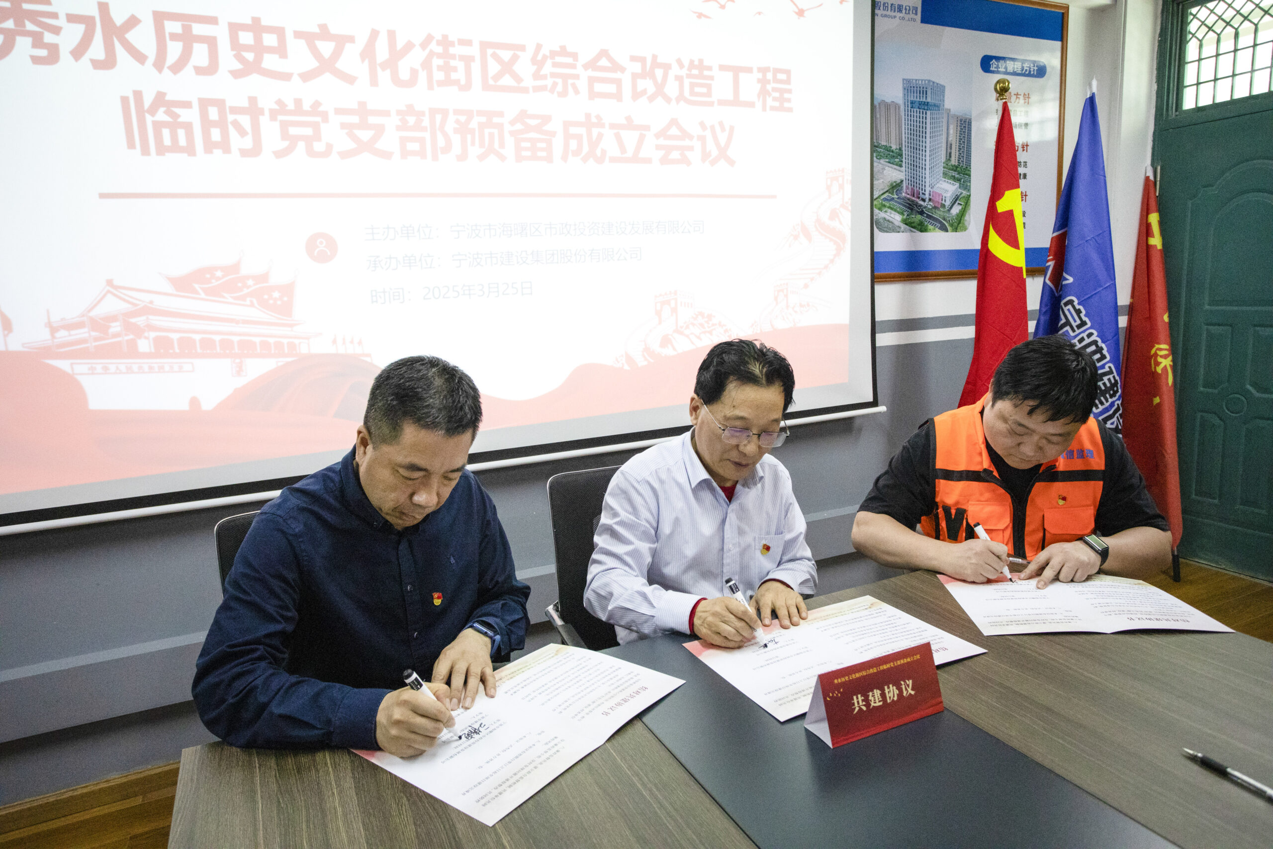 3月25日下午,宁波市海曙区秀水历史文化街区综合改造工程临时党支部预备成立会议在项目部会议室隆重举行。海欣控股集团党委委员、纪委书记、妇联主席傅平南,下属市政公司党支部书记、总经理刘春晖,宁波建设集团工会主席苗志春,宁波建设集团市政分公司工会主席卞铁勇等出席本次会议。
