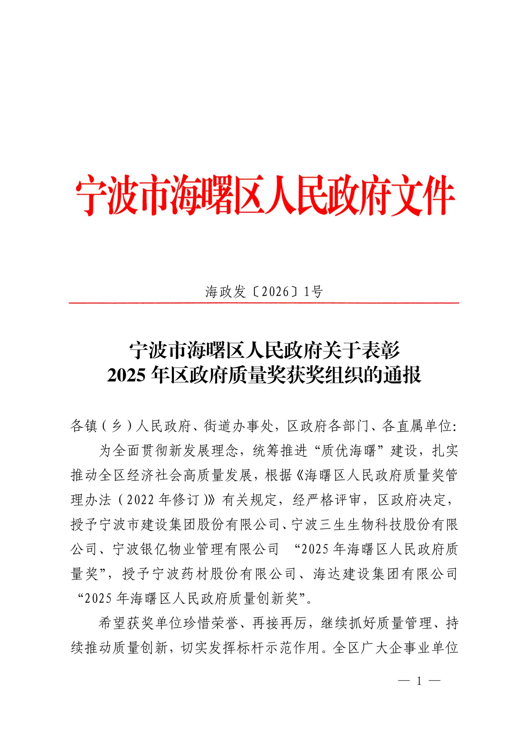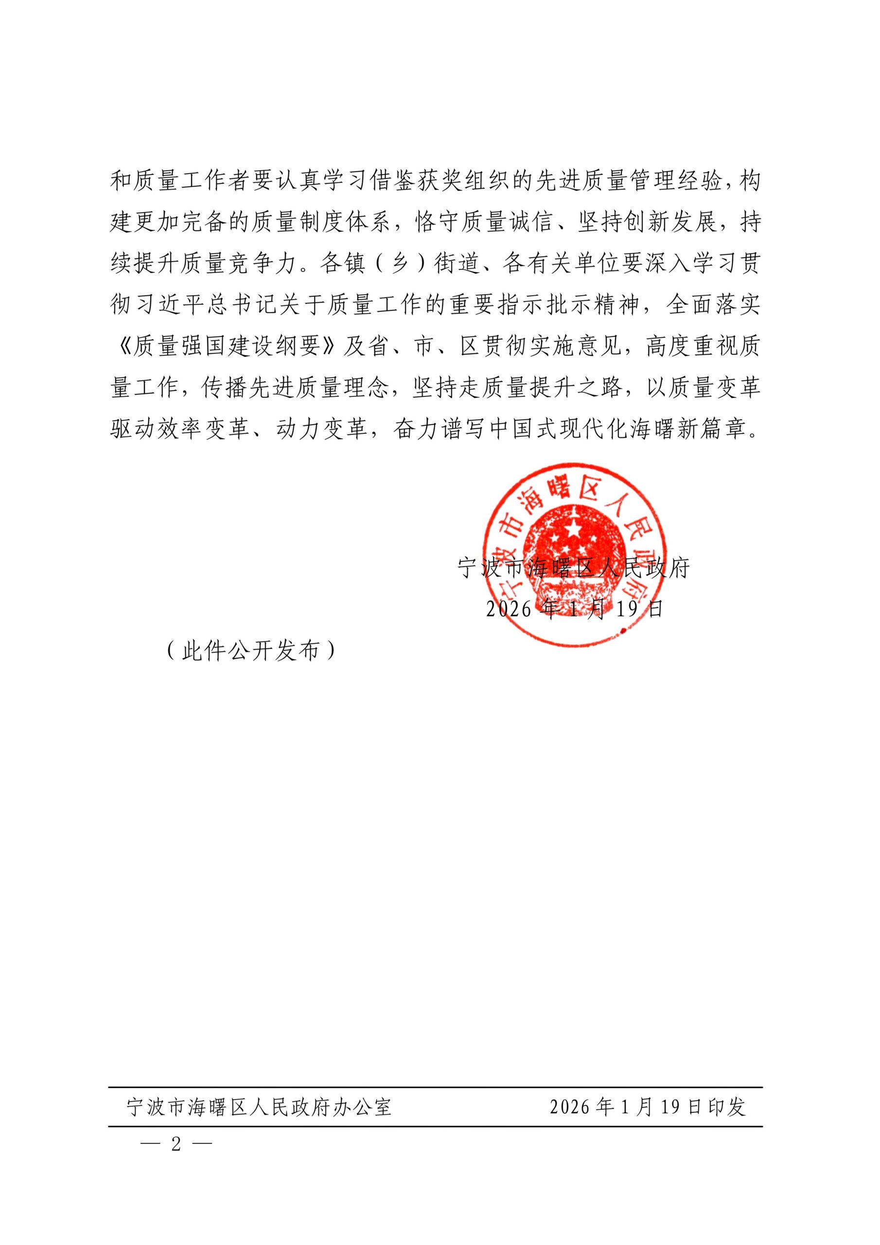 近日,海曙区人民政府公布2025年度质量奖获奖名单,公司凭借卓越的管理体系、突出创新能力与显著社会效益,成功摘得这一区域最高质量荣誉。