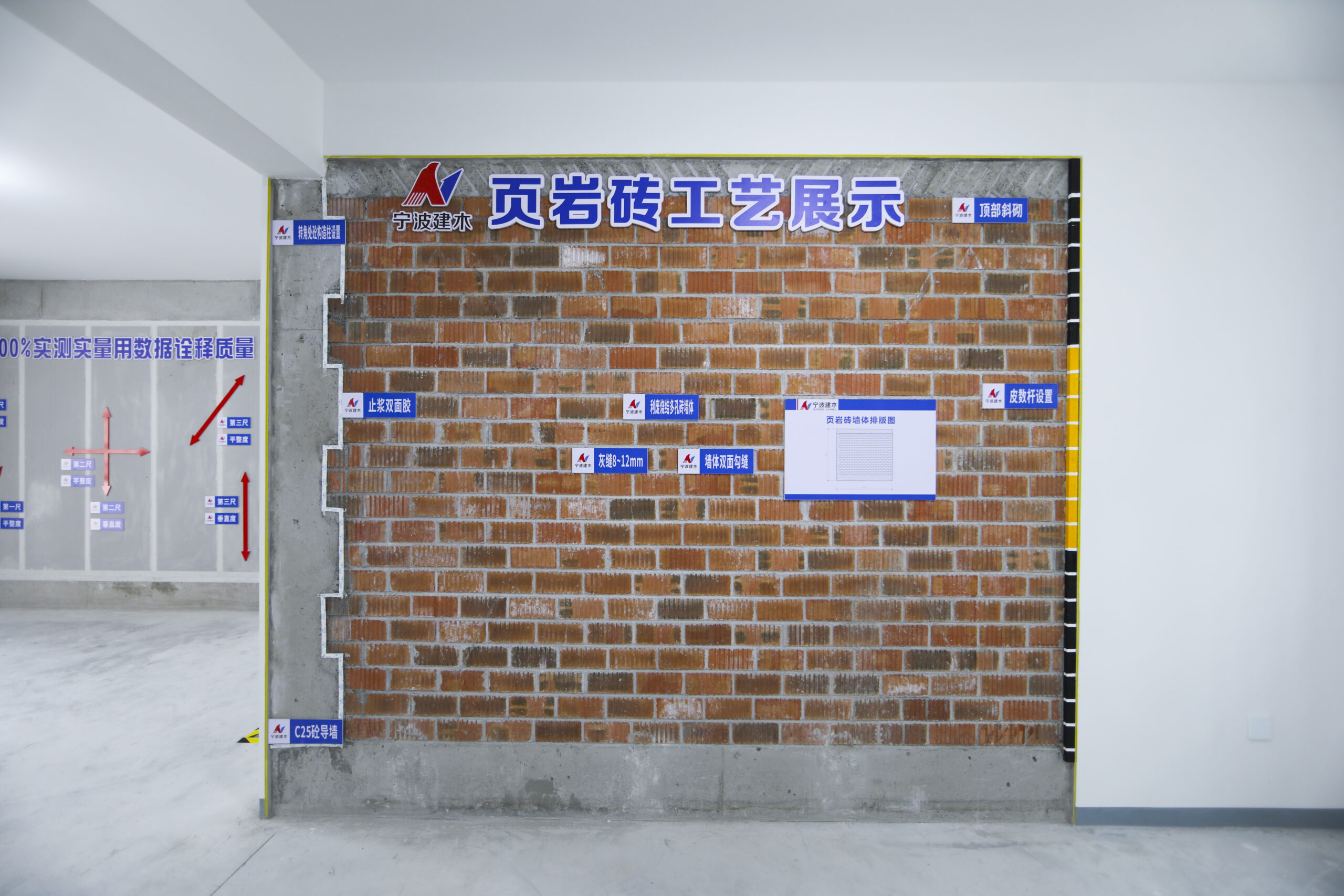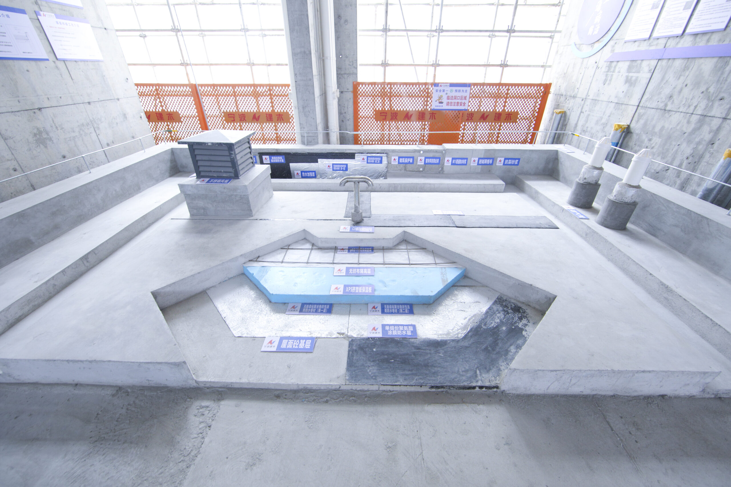 在智慧工地展示区,BIM技术、VR/AR安全体验、消防无人机、智能施工升降机及人体感应监测系统等智能化应用成为焦点。特别是现场设置的安全体验区与VR/AR体验区,通过“被动说教”到“主动体验”的转变,让作业人员沉浸式感受安全防护的重要性。楼层内悬空与攀登作业安全带使用点采用生命线布设、工具式穿墙螺杆等多种防护形式,全面规范高处作业安全管理。
