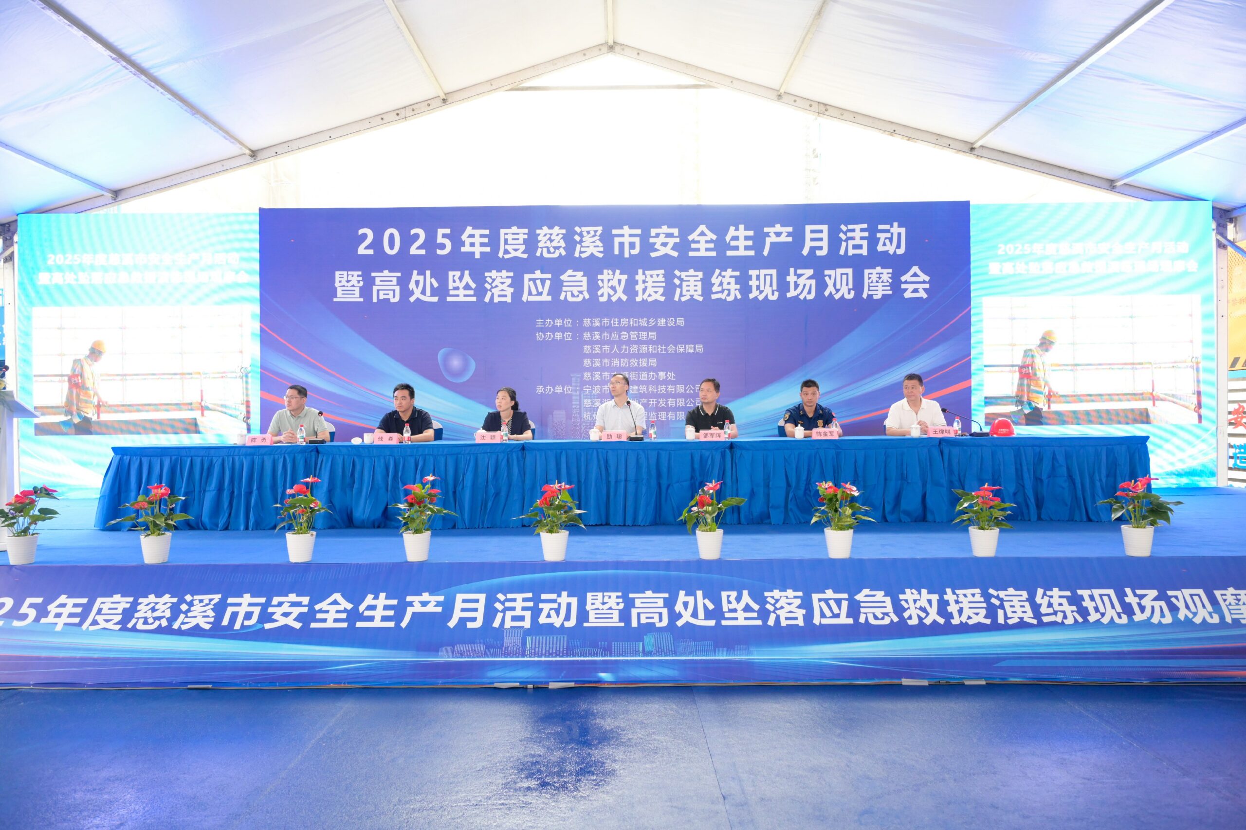 为深入贯彻习近平总书记关于安全生产的重要论述,全面落实建筑领域安全管理要求,6月11日,2025年度慈溪市安全生产月活动暨高处坠落应急救援演练现场观摩会,在我公司承建的新潮塘5#地块项目现场隆重举行。本次活动由慈溪市住房和城乡建设局主办,宁波市建木建筑科技有限公司承办,吸引了市人社局、应急管理局、消防救援大队等多部门负责人及全市在建项目参建单位代表共计近500余人参与。
